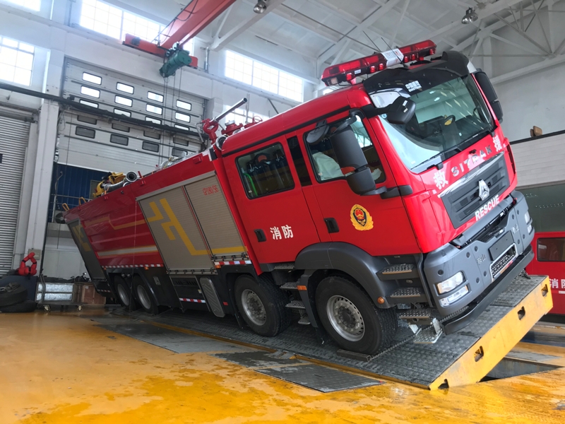 車輛底盤(pán)為汕德卡ZZ5446V516MF5底盤,發動機型號:MC13.54-61,功率:400kw,國六排放標準(zhǔn),軸距:1950+4500+1400mm,罐體材質:優質不鏽鋼304,容罐(guàn)容量:水10000kg,泡沫5000kg,幹粉罐額定充裝量:3000kg,消防泵為8FGR-美國Hale(希爾),消防炮為泡沫水(shuǐ)兩用炮,型號為DICODOPLUS 150法國POK博克,幹粉炮為萃聯PF40,照明(míng)係統為星際(jì),主照明(míng)燈(dēng)功率:600W×4 整車由底盤、罐體、箱體、管路、幹粉氮氣係統、照明係統等主要結構組成,罐體采(cǎi)用優(yōu)質不鏽鋼304。設計厚度:4:4:3(底板:側板(bǎn):防(fáng)蕩板);箱體主骨架為優質型鋼,蒙板(bǎn)為優質氧化鋁合金平板(bǎn)粘接結構(gòu)。全鋼框(kuàng)架焊接結構,左右後三側為鋁合金卷簾門(mén),車身右後側設上爬梯,下設防滑翻轉踏板。器材(cái)箱內骨架(jià)采用鋁合金型材內藏式搭接技術,可(kě)提高空間利用率和可變性,內部底板采用鋁花紋板,內蒙板與(yǔ)框架(jià)之間采用粘接技術(無鉚釘)。管路係統(tǒng)由外進(jìn)水管路、內進水管路、出水管路、注液管路、泡沫管路、放餘(yú)水管路、冷卻水管路(lù)、全自動泡沫比例混合器組成。幹粉罐材質為16MnR,配有裝(zhuāng)粉口、排(pái)粉口、氮氣輸送管和出粉管,罐(guàn)內氮氣輸送管(guǎn)為環行並(bìng)配多個進氣閥,使氣體與幹粉混合均勻呈流態。